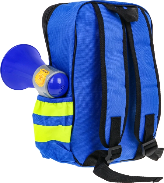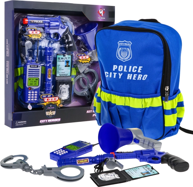 | | - sac à dos, - menottes, - pistolet, - badge avec insigne, - sifflet avec cordon, - talkie-walkie, - mégaphone, - lampe de poche, - clés des menottes, |