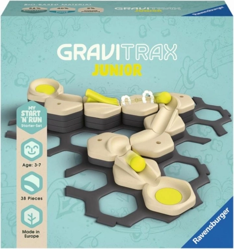 GraviTrax Junior set de démarrage pour enfants dès 3 ans. Circuit à billes interactif en bioplastique d’origine bois, construction créative et extension facile.