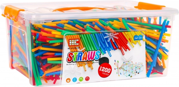 Grand set de pailles de construction avec au total 1200 pièces développant la créativité, la pensée logique et la motricité fine des enfants dès 3 ans. Grâce aux pailles et connecteurs multicolores, il est facile de construire des tours, véhicules, ponts et bâtiments. Le tout est rangé dans une boîte en plastique avec poignée pour un transport aisé.