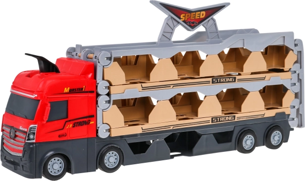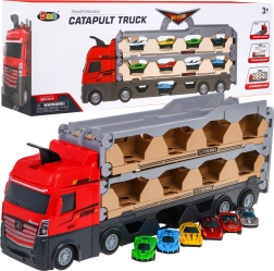 Sur le toit du camion, une poignée confortable permet un transport facile. À l’intérieur, vous trouverez 3 niveaux pour trier et ranger les petites voitures, afin de les avoir toujours à portée de main. La catapulte est simple à utiliser – il suffit de placer la voiture au niveau inférieur et d’appuyer sur le levier sur le toit. Aucune pile n’est nécessaire.