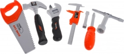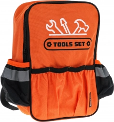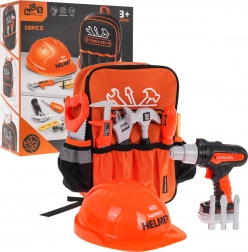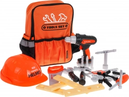 sac à dos, casque, perceuse sans fil avec embouts (plat, cruciforme, foret), marteau, scie, tournevis avec embouts (plat, cruciforme), clé réglable, pied à coulisse, clé, 6× vis, 6× écrou, 4× plaque de montage