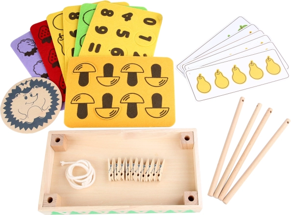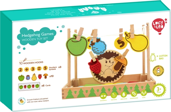 Le set comprend une base en bois, un hérisson, des cartes amusantes et des supports en feutre colorés - idéal pour jouer ensemble avec plusieurs enfants. Pour un rangement facile, tout est emballé dans un sac en coton pratique.