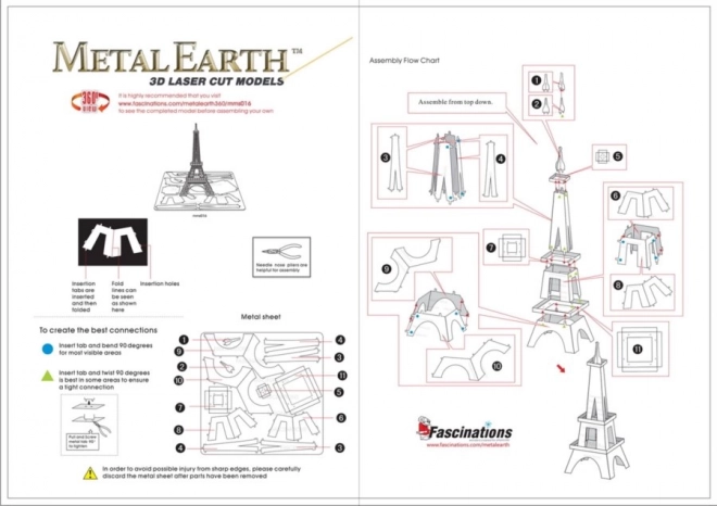 Retirez chaque pièce des plaques métalliques, en utilisant si nécessaire une petite pince coupante (non incluse). Les pièces s’assemblent à l’aide de verrous formés par une languette et un trou. Pliez la languette à l’aide de petites pinces fines (non incluses) et assemblez progressivement tous les verrous pour créer une pièce maîtresse très réaliste !