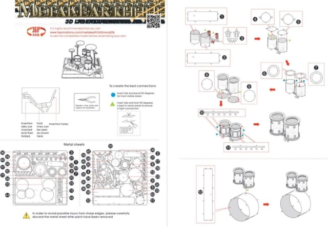 Retirez chaque pièce des plaques métalliques ; si nécessaire, utilisez une petite pince coupante (non incluse). Les pièces s’assemblent à l’aide de loquets formés par une languette et un trou. Pliez la languette avec une petite pince plate (non incluse) et assemblez progressivement toutes les fixations jusqu’à obtenir une pièce maîtresse très réaliste !