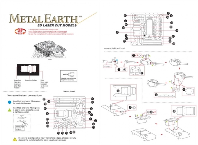 Retirez les différentes pièces des plaques métalliques ; si nécessaire, utilisez de petites pinces coupantes (non incluses). Les pièces s’assemblent à l’aide de verrous formés par une languette et un trou. Pliez la languette à l’aide de petites pinces fines (non incluses) et assemblez progressivement tous les verrous jusqu’à obtenir une pièce maîtresse très réaliste !