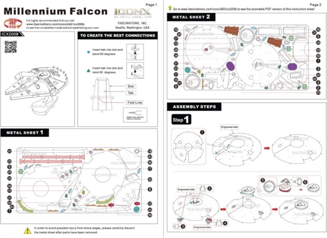 Détachez chaque pièce des feuilles métalliques ; si nécessaire, utilisez de petites pinces coupantes (non incluses). Les pièces s’assemblent au moyen de verrous formés par une languette et un trou. Pliez la languette à l’aide de petites pinces fines (non incluses) et assemblez progressivement tous les verrous jusqu’à obtenir une pièce maîtresse très réaliste !