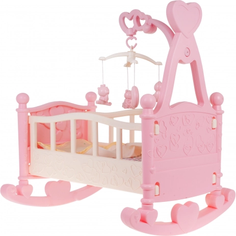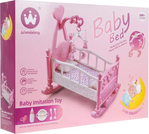 Berceau pour poupées avec accessoires, un jouet adapté aux enfants à partir de 3 ans. Le berceau est fabriqué dans une délicate gamme de couleurs pastel en plastique de la plus haute qualité. L’ensemble n’a pas d’arêtes vives et est sûr pour l’enfant. |
