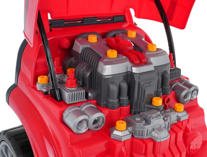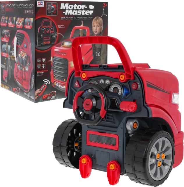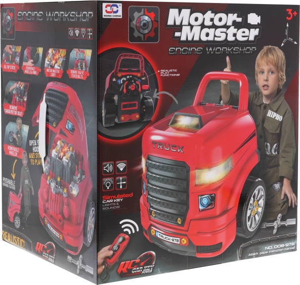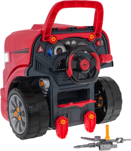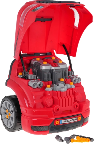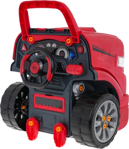 . | Superbe kit de construction interactif, bien équipé, pour petit mécanicien dès 3 ans. L’ensemble comprend une cabine de camion avec capot relevable, volant, tableau de bord, ainsi qu’une poignée pratique et des roulettes pour le transport. Sous le capot du camion se trouvent de nombreuses pièces à assembler et à démonter. Votre enfant pourra effectuer des réparations du moteur, des bougies d’allumage et même des roues. Sur le tableau de bord, on trouve un bouton de démarrage du véhicule avec bruit de mise en route et sons de conduite, un volant avec klaxon et un avertisseur d’urgence. Sous le volant, un espace de rangement permet de stocker tous les outils, vis et boutons nécessaires. Le set est en outre doté d’un autopilote permettant de contrôler les modules lumineux (phares allumés et partie supérieure du moteur) et sonores (son d’ouverture et de fermeture du véhicule, klaxon). Alimentation : 3 x piles AA 1,5 V – voiture (non incluses), CR2025 3 V – télécommande (incluse). .Caractéristiques du set : .- capot ouvrant, .- volant rotatif avec klaxon, .- espace de rangement pour les outils sous le volant, .- de nombreuses pièces rotatives sous le capot, .- possibilité de changer les bougies d’allumage, de vérifier le niveau d’huile, de réparer les roues, .- boîte de vitesses automatique avec levier, .- fonctions lumineuses : phares clignotants, bouton de démarrage et mise en route du moteur, bouton d’urgence, moteur, .- fonctions sonores : sons de démarrage du véhicule, sons de conduite, sons de marche arrière, klaxon, .- mini cric pliable pour dévisser et revisser les roues, .- autopilote avec boutons fermer, ouvrir, klaxon, avec effets sonores et lumineux, .- poignée confortable pour déplacer le jouet. . |