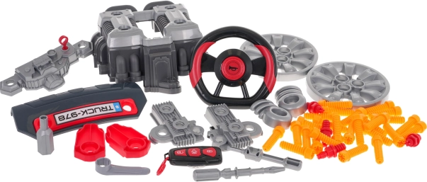 . | Le set comprend 61 éléments, dont : .- partie avant du chariot de réparation, .- roues avec enjoliveurs, .- vis, .- outils, .- pièces de moteur, .- autopilote, .- autocollants décoratifs. |