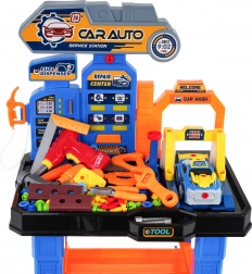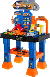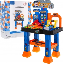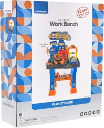 Le set comprend 125 pièces d’accessoires : outils (marteau, scie, pince, clés), tournevis-perceuse à piles, vis, embouts, adaptateurs et autocollants décoratifs. La petite voiture peut être démontée et personnalisée, ce qui encourage la pensée technique et la coordination œil-main. L’établi stable se monte facilement et convient parfaitement au jeu à la maison.