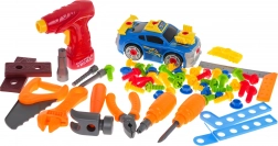 Dévisse, visse et assemble la petite voiture à l’aide de la perceuse, des tournevis et des embouts. Favorise la motricité fine et la pensée technique.