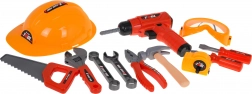 Scie, marteau, pince, tournevis, clés, étau, engrenages, éléments de fixation, lunettes et casque – tout pour jouer en toute sécurité et stimuler la créativité.