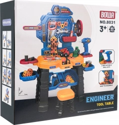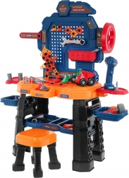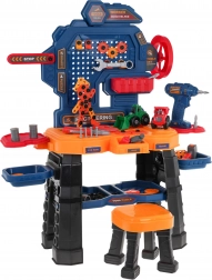 Ce set d’atelier coloré transforme la chambre d’enfant en véritable mini-atelier. Un établi robuste avec étagères et organisateur est complété par un tabouret confortable et une perceuse sans fil à piles (2× AA, non incluses). Les enfants peuvent visser, percer et assembler leurs propres projets, y compris deux véhicules de chantier – une chargeuse et un camion-benne.