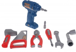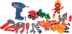 Il comprend un large assortiment d’outils : perceuse avec embouts, scie, marteau, tournevis, clés, pince, des dizaines de vis, chevilles et rondelles ainsi que des engrenages pour une première initiation à la mécanique. Grâce au grand nombre de pièces et aux panneaux de formes, les enfants entraînent patience, logique et coordination.