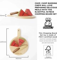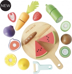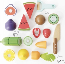 Ce set de qualité pour petits chefs offre un jeu réaliste plein de fantaisie. Il comprend une planche en bois naturel, un éplucheur, un couteau et une sélection d’aliments appétissants qui peuvent être facilement « découpés » et recomposés grâce au velcro. Idéal pour développer la coordination, la motricité fine et le jeu de rôle.