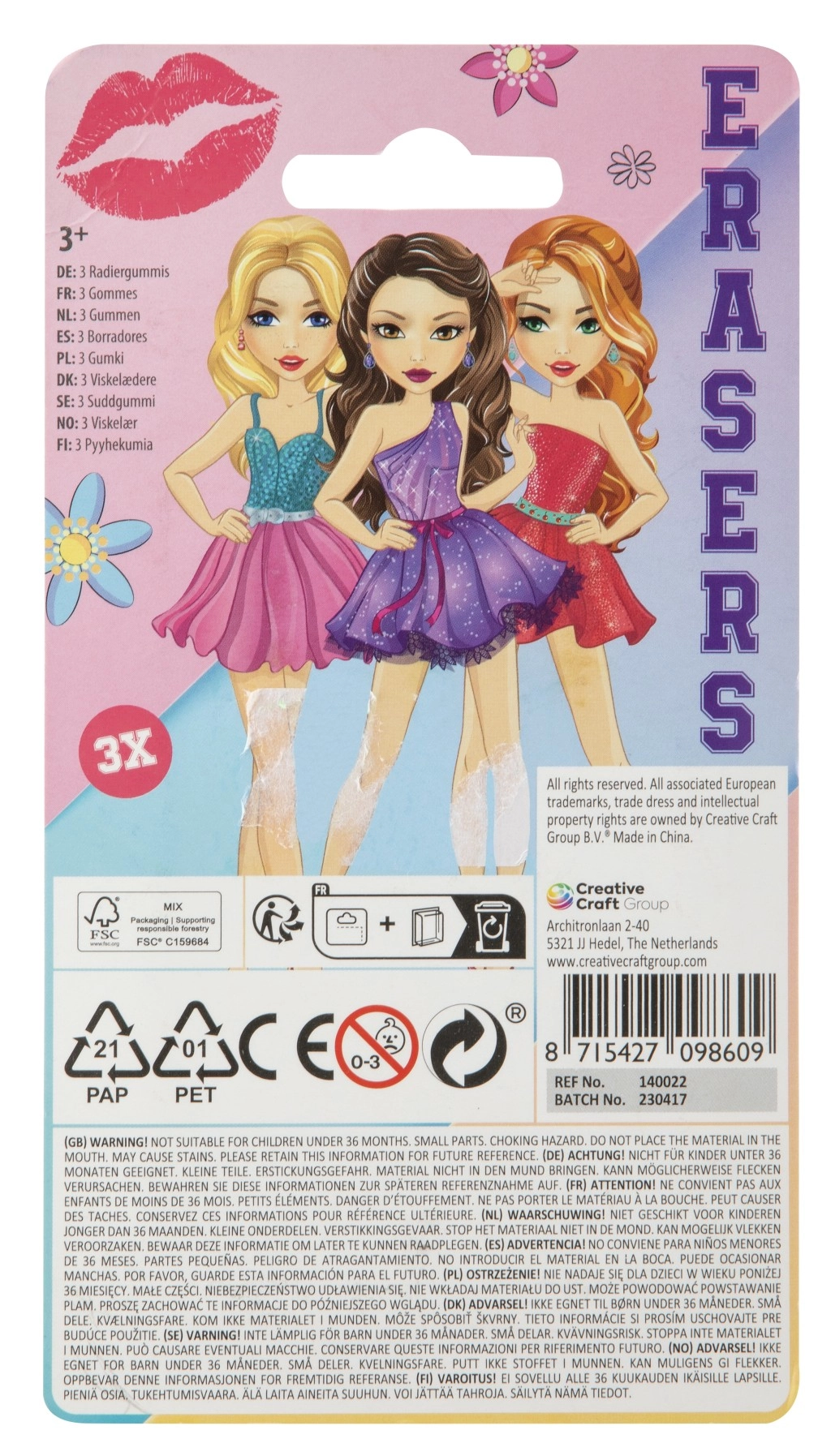 Set de trois gommes en forme de rouge à lèvres Besties offrant trois couleurs différentes pour effacer avec plaisir les petites erreurs.