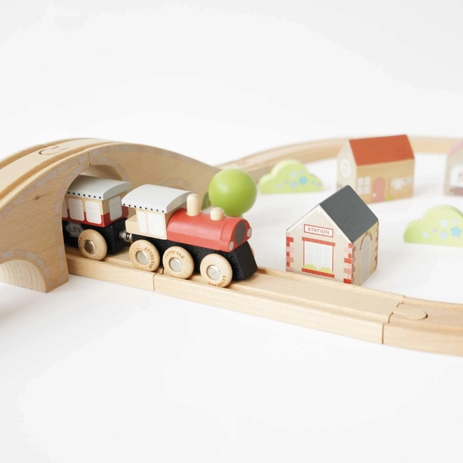 Ce circuit de train est un outil parfait pour encourager le jeu imaginatif chez les jeunes enfants. Il est fabriqué en bois de haute qualité avec une certification FSC, garantissant qu'il est respectueux de l'environnement. Le kit comprend :