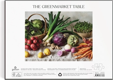 Profitez d’un assemblage exigeant mais savoureux avec le puzzle GALISON Greenmarket Table de 1500 pièces. Impression de qualité supérieure avec encres sans substances nocives, finition mate pour des couleurs fidèles et des détails nets, et boîte robuste pour une réutilisation prolongée. Fabriqué en papier recyclé avec un accent sur la durabilité. Illustration de l’artiste Bella Karragiannidis.