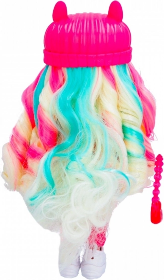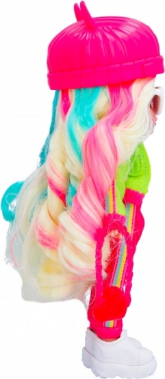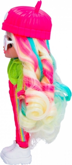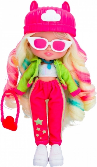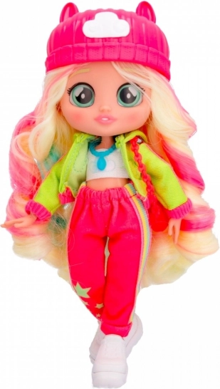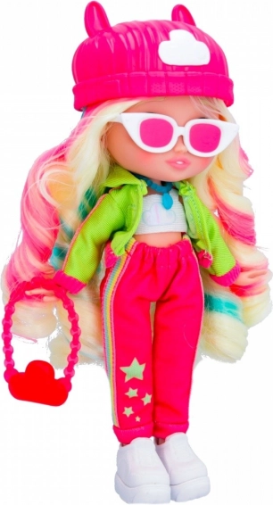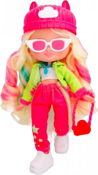 La poupée est vêtue d’une tenue tendance comprenant un chapeau rose et des accessoires marquants, offrant un look unique.