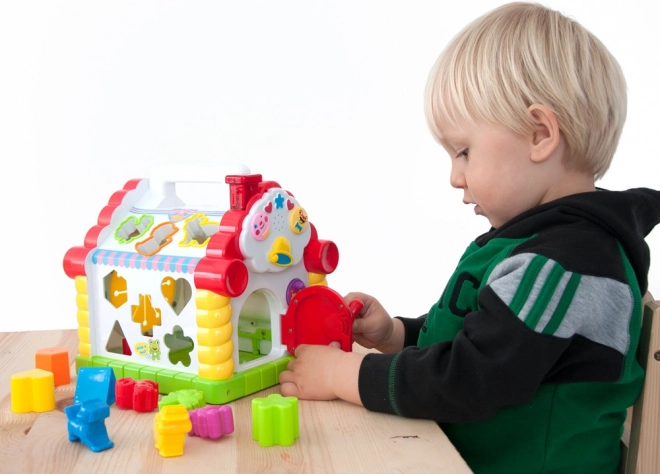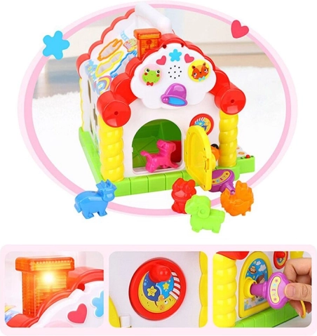 - Espace pour l'insertion de formes: Sur le toit de la maison, il y a des ouvertures pour insérer des formes et des animaux, qui jouent des sons lorsqu'ils sont correctement placés.