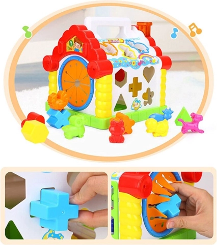 La maison permet aux enfants d'insérer différentes formes et animaux dans les trous appropriés, ce qui stimule leur motricité fine et la reconnaissance des formes et des sons.
