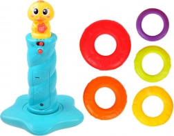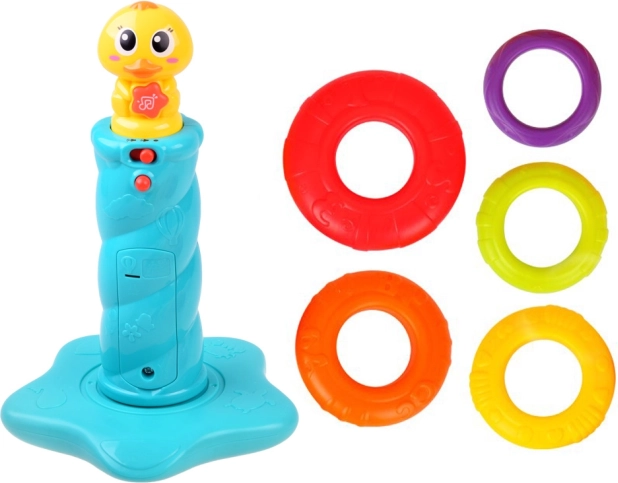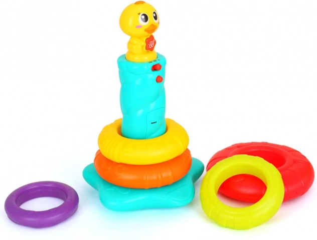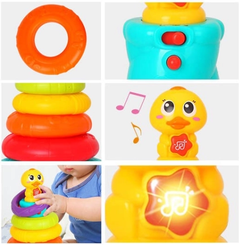 Lorsque l’on empile les anneaux, le canard joue des tonalités joyeuses, coasse et un voyant clignote sur son ventre – motivant l’enfant à recommencer et à explorer.