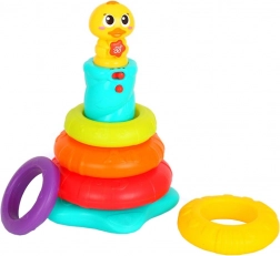 La tour empilable interactive avec petit canard apporte aux enfants la joie de la découverte. Cinq anneaux colorés s’enfilent sur une tige stable surmontée d’une tête de canard, qui émet des sons ludiques et des coassements et allume un voyant clignotant pendant le jeu. Lorsque l’enfant ne joue pas pendant un moment, le canard se rappelle par des sons gais et invite à explorer.