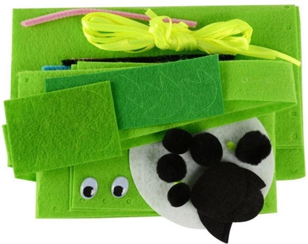Les pièces en feutrine prédécoupées avec trous et l’aiguille en plastique permettent aux enfants de coudre le sac en toute sécurité et simplement, étape par étape.
