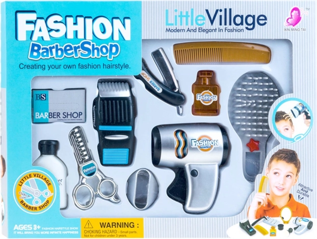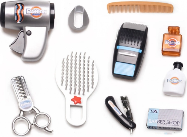 Le kit comprend tous les outils nécessaires pour jouer au salon de coiffure, des ciseaux de coupe aux flacons de shampoing et d’eau de Cologne.