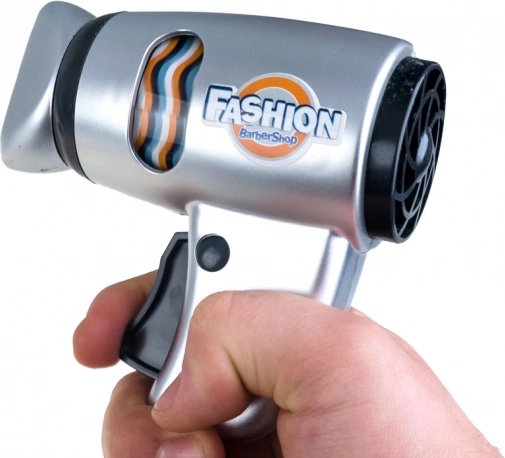 Le set comprend un sèche-cheveux qui, en appuyant sur un bouton, déclenche un tambour interne rotatif pour une expérience plus réaliste.