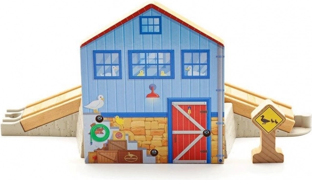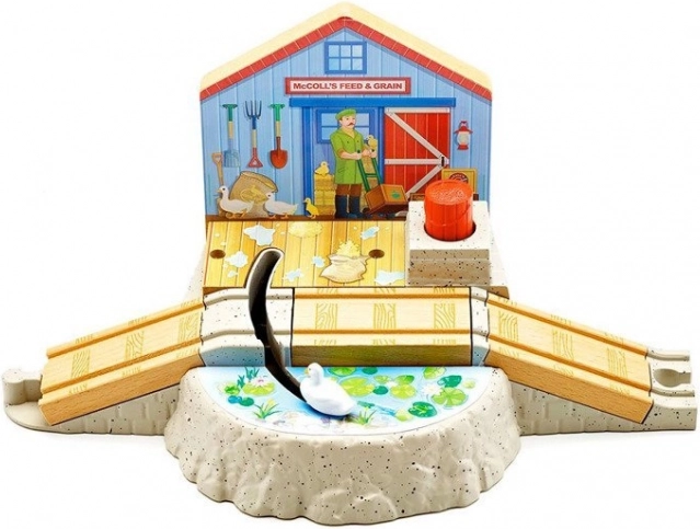 Appuyez sur le bouton rouge en forme de tonneau et regardez l’histoire des canards prendre vie le long de la voie.