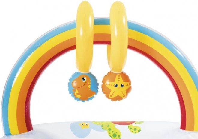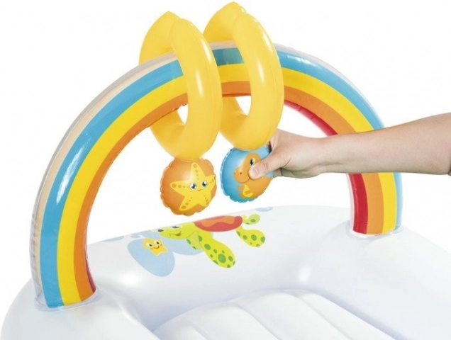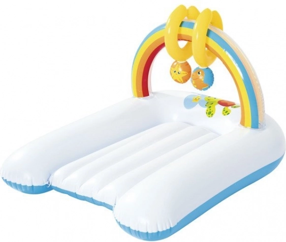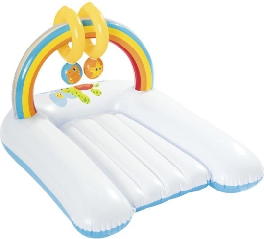 Au-dessus du matelas se trouve une arche colorée avec deux jouets sonores qui captent l’attention de l’enfant et facilitent le change. Une fois dégonflé, il se plie facilement en un petit paquet – une solution parfaite pour les voyages, vacances et visites.