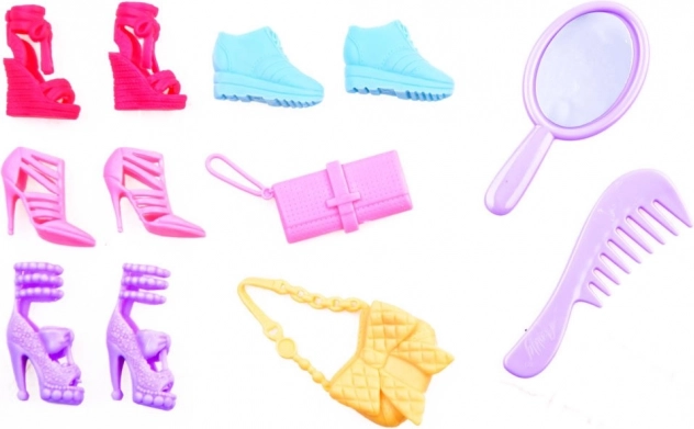 Poupée, plusieurs pièces de vêtements (robes, t-shirts, pantalons), plusieurs paires de chaussures, sac à main, accessoires de coiffure (sèche-cheveux, lisseur, ciseaux, pulvérisateur), peigne, miroir