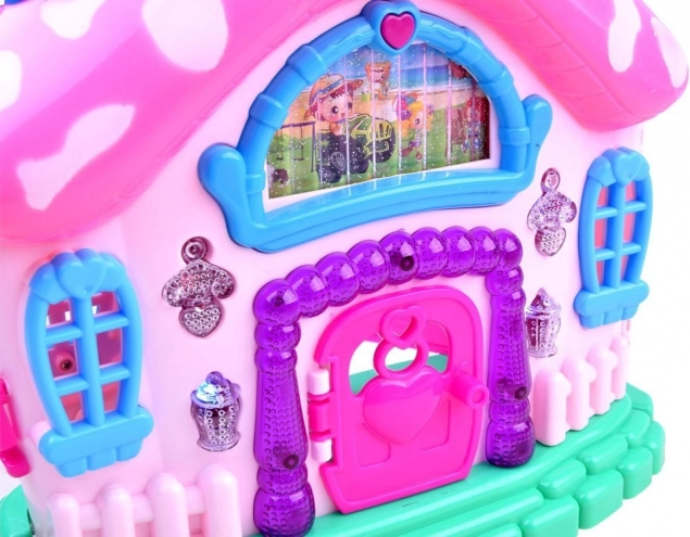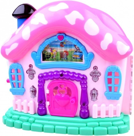 Un design unique en forme de champignon avec un toit rose et des pois blancs crée une atmosphère enchanteresse pour jouer.