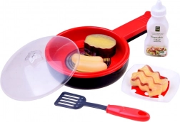 L'ensemble comprend une poêle, un couvercle, plusieurs types d'aliments et accessoires que les enfants peuvent utiliser pour jouer à cuisiner.