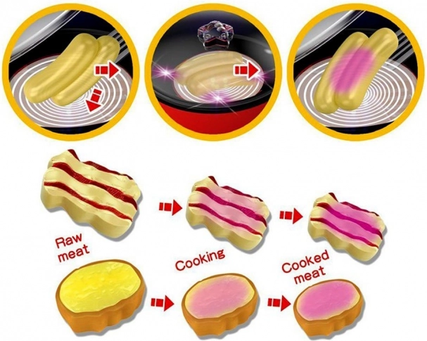 La poêle émet des sons de friture authentiques et change de couleur, ce qui rapproche l'expérience d'une véritable cuisine.