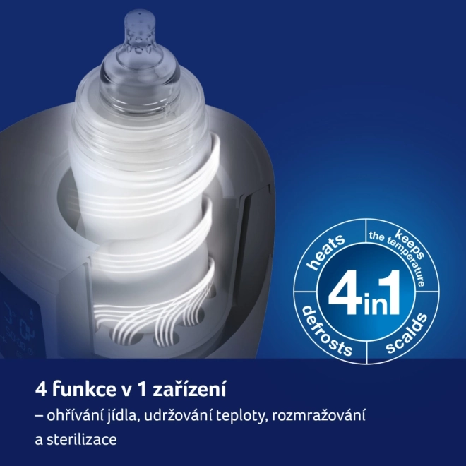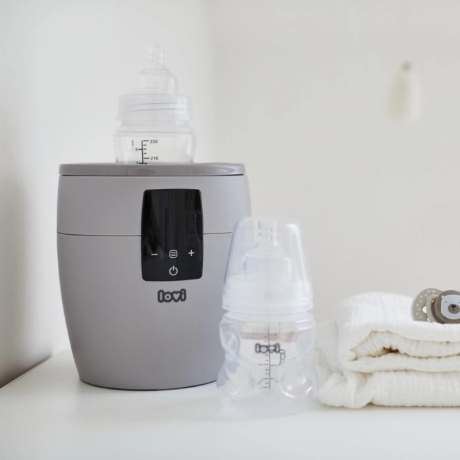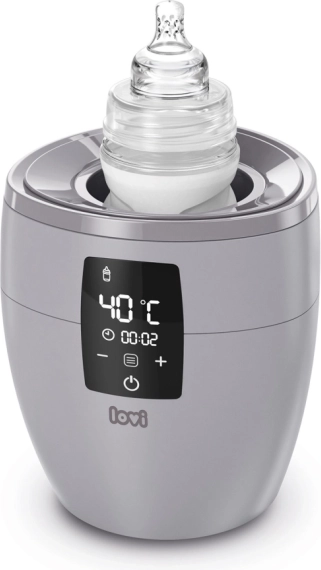Chauffe-biberon LOVI 4 en 1. Chauffage rapide et uniforme. Commandes intuitives sur un écran clair. 4 fonctions en trois modes : mode BOTTLE – chauffage des liquides dans un biberon, décongélation des repas conservés dans un sachet. Maintient la température souhaitée jusqu’à 10 heures. Mode HOT – chauffe rapide du repas + fonction de stérilisation des biberons et accessoires. Mode DINNER – maintient la température souhaitée jusqu’à 3 heures. Sécurisé – arrêt automatique en l’absence d’eau en mode HOT. Doseur d’eau inclus dans l’emballage. Le chauffe-biberon Lovi est une façon idéale et sûre de chauffer les repas. Il contient un thermostat qui maintient la température réglée très longtemps. Il protège le repas contre la surchauffe et la perte de vitamines et minéraux précieux. Le chauffe-biberon ultra-rapide LOVI règle automatiquement le temps de chauffage du repas qu’il soit réfrigéré, congelé ou à température ambiante. Le chauffe-biberon Lovi est conçu pour chauffer des repas dans les types de biberons ou pots suivants : • dans les biberons Lovi et la plupart des autres biberons à col large • dans les biberons classiques, • dans les petits pots pour aliments pour enfants. La largeur maximale du biberon adaptée à ce chauffe-biberon est de 6,5 cm. 4 fonctions en 1 – chauffe, maintient la température, décongèle et stérilise à la vapeur. Rapide – chauffe un repas en 2 minutes, ce qui le place devant la plupart des chauffe-biberons disponibles sur le marché. *80 ml de lait/eau à une température initiale de 21 °C. Universel – compatible avec la plupart des biberons pour nourrissons disponibles sur le marché. Sécurisé – arrêt automatique en l’absence d’eau en mode HOT. Le chauffe-biberon répond aux exigences suivantes : Directive 2006/95/CE du Parlement européen et du Conseil relative à l’harmonisation des législations des États membres concernant le matériel électrique destiné à être utilisé dans certaines limites de tension. Directive 2011/65/UE du Parlement européen et du Conseil relative à la limitation de l’utilisation de certaines substances dangereuses dans les équipements électriques et électroniques. Directive 2004/108/CE du Parlement européen et du Conseil relative au rapprochement des législations des États membres en matière de compatibilité électromagnétique. Avertissement : Les instructions précises pour l’entretien approprié et correct du produit se trouvent dans le manuel d’utilisation.