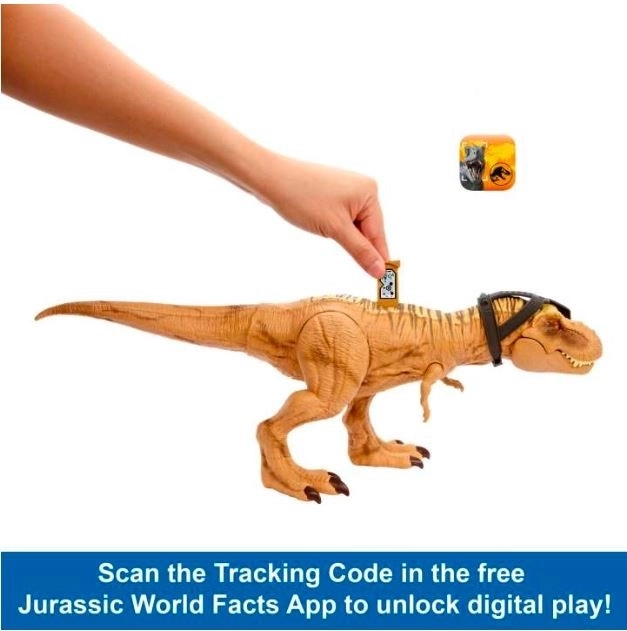 En appuyant sur le bouton, le T‑Rex ouvre la gueule et tourne la tête sur le côté, reproduisant fidèlement des scènes des films Jurassic World. En scannant le tag ADN caché dans l’application Jurassic World Facts, vous débloquerez des informations enrichies et des défis de jeu.