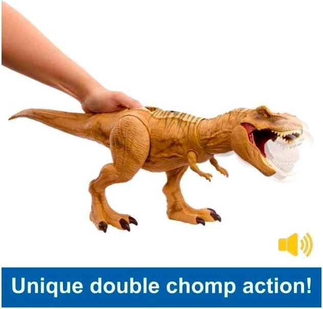 En appuyant sur le bouton, le T‑Rex ouvre la gueule et tourne la tête sur le côté, accompagné d’un rugissement de dinosaure réaliste inspiré des films Jurassic World.