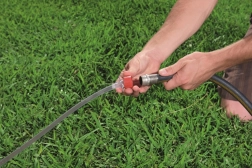 Un arroseur intégré au centre du bassin crée une pluie d’eau – il suffit de brancher un tuyau d’arrosage standard et le plaisir peut commencer.