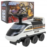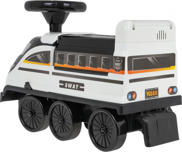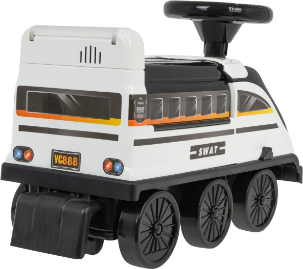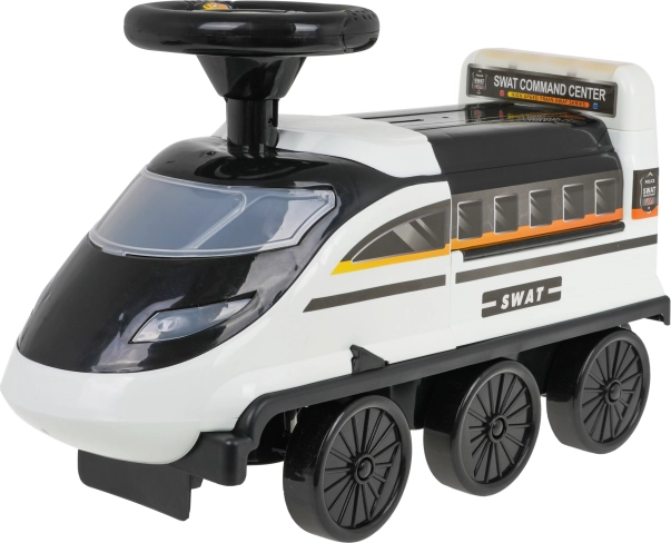 La draisienne interactive en forme de locomotive offre une expérience de jeu inoubliable. Conçue en plastique de haute qualité, résistant et non toxique. Ce porteur se déplace sur six roues, dont deux avant pivotantes. Sous le siège se trouve un parc de police déployable avec rampes, ascenseur mobile, barrière ouvrante, pont élévateur et molette rotative.