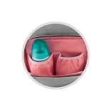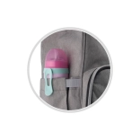 - Confort en déplacement : poche isotherme pour biberon/tasse, cordon avec clip pour clés, possibilité de fixation sur poussette.