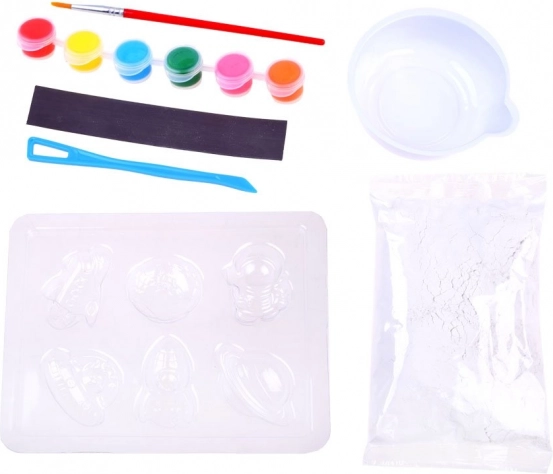 Le kit comprend du plâtre, un bol, une spatule de mélange, 6 peintures, un pinceau, un ruban magnétique et une notice – il suffit d’ajouter de l’eau et de commencer à créer.