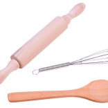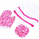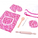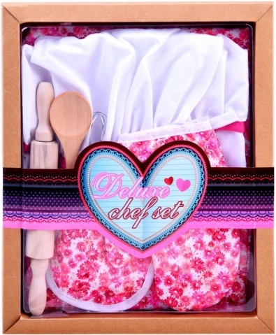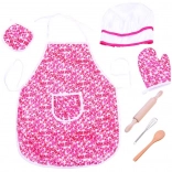 Comprend tous les essentiels pour un petit chef : tablier, toque, gant, dessous-de-plat et outils de cuisine.