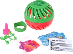 - Boule en deux parties avec minuteur, collerette (adaptateur), embout de remplissage pour ballons d’eau, cartes de questions (EN), env. 30 ballons, 6 clips réutilisables