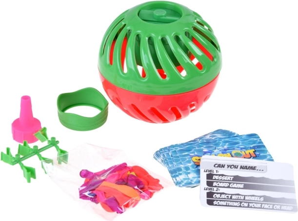 Le jeu Splash Out propose une mécanique simple pour un maximum de fun : remplissez les ballons d’eau, placez-les dans la boule en deux parties avec minuteur, lancez le temps et commencez à répondre. Faites circuler la boule jusqu’à la fin du temps — le ballon éclate et quelqu’un sera mouillé ! Les cartes de questions (en anglais) stimulent la créativité et la pensée rapide.