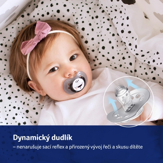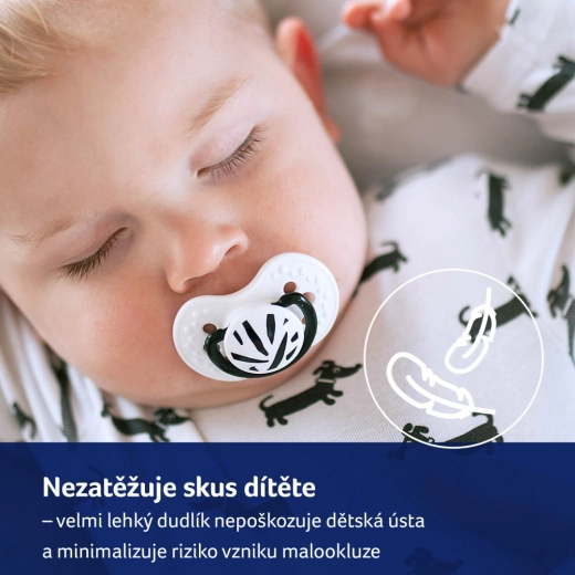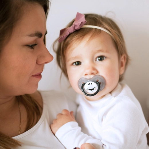 La tétine en silicone multicouche s’adapte au rythme de succion, favorise le développement sain du palais et ne déforme pas l’occlusion.