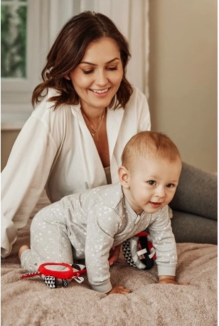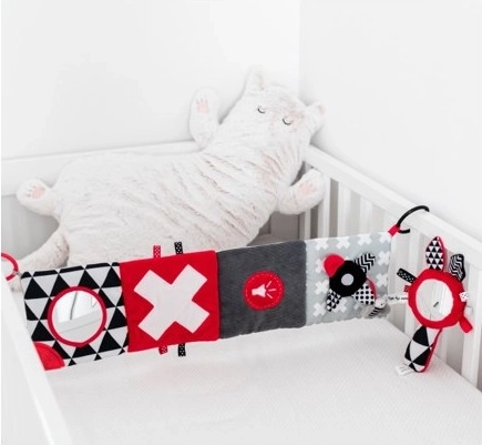 L’haltère hochet contrastée avec miroir de la collection SENSORY est destinée aux tout-petits. Grâce à sa forme pratique, le jouet est facile à saisir. L’haltère comporte des éléments qui couinent, un miroir et des rubans en tissu. Les couleurs sensorielles stimulent le développement des sens de l’enfant. Plus d’informations sur le produit dans cette vidéo : https://www.youtube.com/watch?v=TiuOPH8SJAk&list=PLyuCTn7E_UX4T16PNxfqFjffk4yO1xNXC&index=6 Pourquoi les jouets sensoriels sont-ils si importants ? La vue du bébé est le sens le moins développé à la naissance. L’obscurité qui règne dans l’utérus ne permet pas un plein développement prénatal de la vision. Après la naissance, la vue de l’enfant est floue et brumeuse. Le bébé ne perçoit que les contours à une distance d’environ 20 à 30 cm, ainsi que de grandes formes et éléments de l’environnement. Au bout d’environ un mois, il commence à voir les couleurs, d’abord le rouge et le noir. Vers trois mois, il remarque d’autres couleurs vives. Aux alentours de six mois, il commence à distinguer les détails des images et voit beaucoup plus nettement. Au douzième mois, la vision de l’enfant est pleinement développée comme celle d’un adulte et devient un excellent outil pour découvrir le monde. Les jouets sensoriels de la nouvelle collection SENSORY aident ainsi à stimuler la vue de l’enfant et à entraîner sa capacité de concentration dès les premières semaines de vie. À propos de la collection SENSORY : La collection sensorielle a été développée pour les enfants jusqu’à un an. Durant cette période, surviennent les changements les plus importants dans le développement psychomoteur de l’enfant. Les jouets sensoriels répondent à la tendance actuelle du marché, qui vise à soutenir le développement par le jeu, permettant au parent, avec l’enfant, de stimuler la vision, d’exercer la capacité à se concentrer sur un objet, à le focaliser et à le suivre du regard, ainsi qu’à entraîner l’adresse et la coordination. Mode d’emploi : Maintenir propre. Les instructions d’entretien figurent sur l’étiquette cousue. Avertissement ! Important pour la santé et la sécurité de votre enfant ! Avant chaque utilisation, vérifiez soigneusement le produit. Au premier signe de dommage ou d’usure, jetez-le immédiatement et ne l’utilisez plus. Ouvrez l’emballage en déchirant vigoureusement le film sans utiliser de ciseaux. Avertissement ! Conservez l’emballage plastique hors de portée des enfants afin d’éviter tout risque d’étouffement. L’haltère en peluche est conforme aux exigences suivantes : Directive 2009/48/CE du Parlement européen et du Conseil relative à la sécurité des jouets EN 71-1 Sécurité des jouets — Partie 1 : Propriétés mécaniques et physiques EN 71-2 Sécurité des jouets — Partie 2 : Inflammabilité EN 71-3 Sécurité des jouets — Partie 3 : Migration de certains éléments