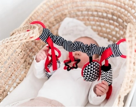 Jouet suspendu contrasté pour poussette/siège auto de la collection SENSORY. Le jouet suspendu avec miroir convient dès les plus petits. Le jouet offre deux options de fixation et peut être placé sur une poussette, un siège auto ou un lit bébé. Les textures variées des matériaux stimulent le toucher de l’enfant. Les tintements et bruissements des matériaux attirent l’attention de l’enfant. Les rubans multicolores encouragent l’enfant à les attraper. Les anneaux de dentition souples apaisent les gencives lors de la poussée dentaire. Les couleurs sensorielles stimulent le développement des sens de l’enfant.Pourquoi les jouets sensoriels sont-ils si importants ?La vue de l’enfant est le sens le moins développé à la naissance. L’obscurité qui règne dans l’utérus ne permet pas à la vue de se développer pleinement pendant la période prénatale. Après la naissance, la vision de l’enfant est floue et brumeuse. Il ne distingue que des contours à une distance de 20 à 30 cm, de grandes formes et des éléments de l’environnement. Au bout d’environ un mois, il commence à voir les couleurs, d’abord le rouge et le noir. Vers trois mois, il remarque d’autres couleurs contrastées. Aux alentours de six mois, il commence à voir les détails des images et sa vision devient bien plus nette. À douze mois, la vue de l’enfant est pleinement développée comme celle d’un adulte et devient un excellent outil pour découvrir le monde. Les jouets sensoriels de la nouvelle collection SENSORY aident ainsi à stimuler la vision de l’enfant et à entraîner sa capacité de concentration dès les premières semaines de vie.À propos de la collection SENSORY:La collection sensorielle de jouets a été conçue pour les enfants de moins d’un an. Durant cette période, les changements les plus significatifs du développement psychomoteur ont lieu. Les jouets sensoriels répondent à la tendance actuelle du marché qui vise à soutenir le développement par le jeu, permettant au parent, avec l’enfant, de stimuler la vision, d’exercer la capacité à se concentrer sur un objet, de fixer et de suivre des objets du regard, ainsi que de travailler l’adresse et la coordination.Mode d’emploi: Maintenez le jouet propre. La méthode de lavage est indiquée sur l’étiquette intérieure.Attention ! Important pour la sécurité et la santé de votre enfant !Avant le montage, retirez tous les éléments d’emballage. Assurez-vous que tous les petits jouets sont correctement et solidement fixés au produit. Fixez le jouet au bord de la capote de la poussette hors de portée de l’enfant et vérifiez qu’il est fermement attaché. Le montage et la fixation du jouet doivent être vérifiés par un adulte avant utilisation. Conservez l’emballage plastique hors de portée des enfants afin d’éviter tout risque d’étouffement. Vérifiez l’état du produit avant chaque utilisation. Au premier signe d’usure ou de dommage, n’utilisez plus le produit – remplacez-le par un neuf. Utilisez le jouet uniquement sous la surveillance directe d’un adulte.Avertissement ! N’utilisez pas le jouet pour des enfants qui commencent à se redresser seuls sur les mains et les genoux. Vous éviterez ainsi tout risque d’enchevêtrement de l’enfant dans le jouet.Le jouet pour poussette est conforme aux certifications : ISO 9001ISO 22716Le produit est conçu et approuvé dans l’UE.