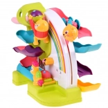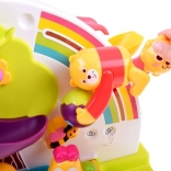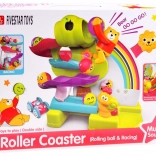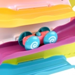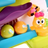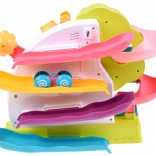 Ce circuit interactif 2-en-1 séduit par ses couleurs vives, ses personnages adorables et ses effets entraînants. En mode billes, en tirant sur le levier à tête de petit lion, la bille est hissée au niveau supérieur puis dévale les quatre étages, accompagnée d’une musique joyeuse avec réglage du volume ou possibilité de couper totalement le son. En mode petite voiture, il suffit de lâcher le véhicule depuis le sommet et regarder filer jusqu’à l’arrivée.